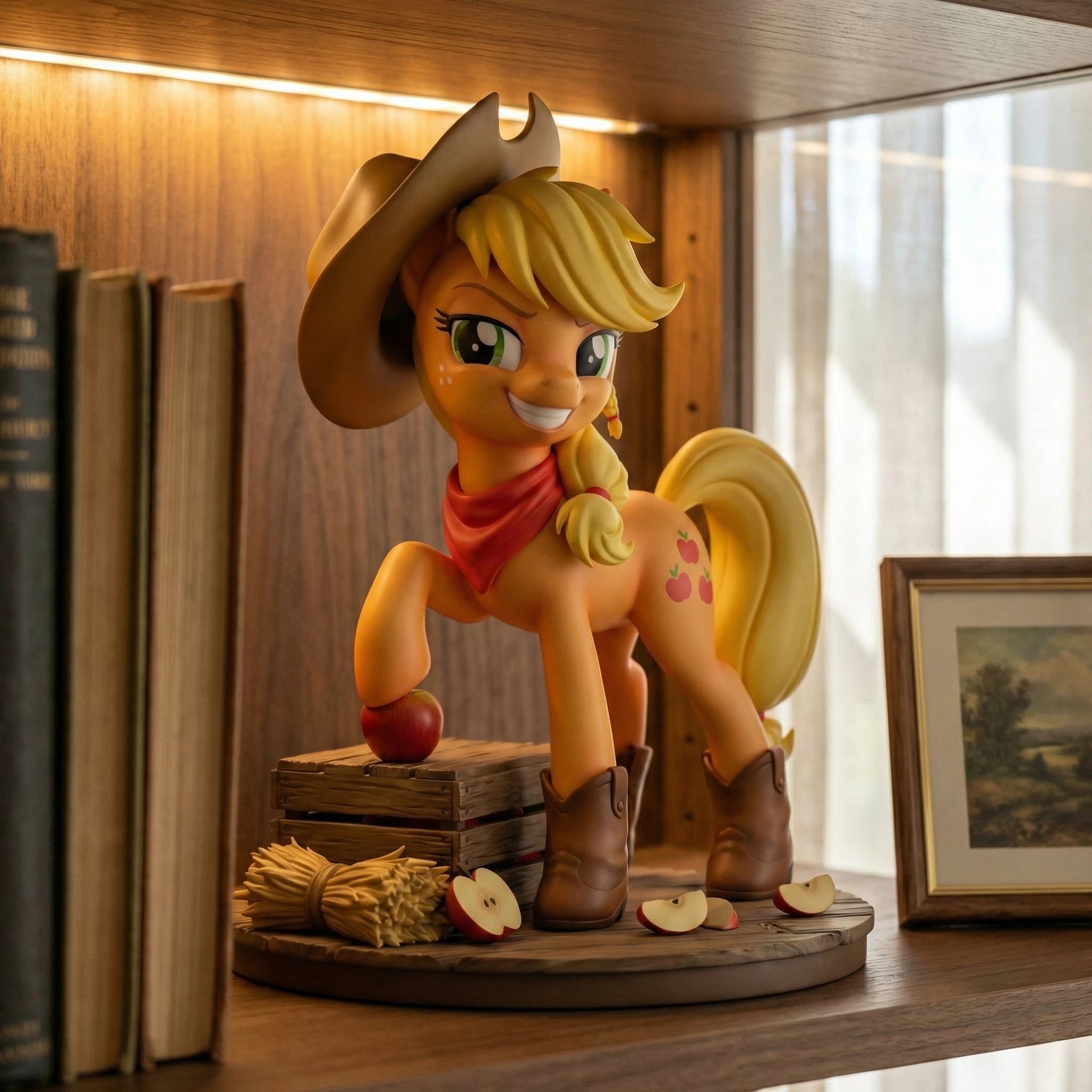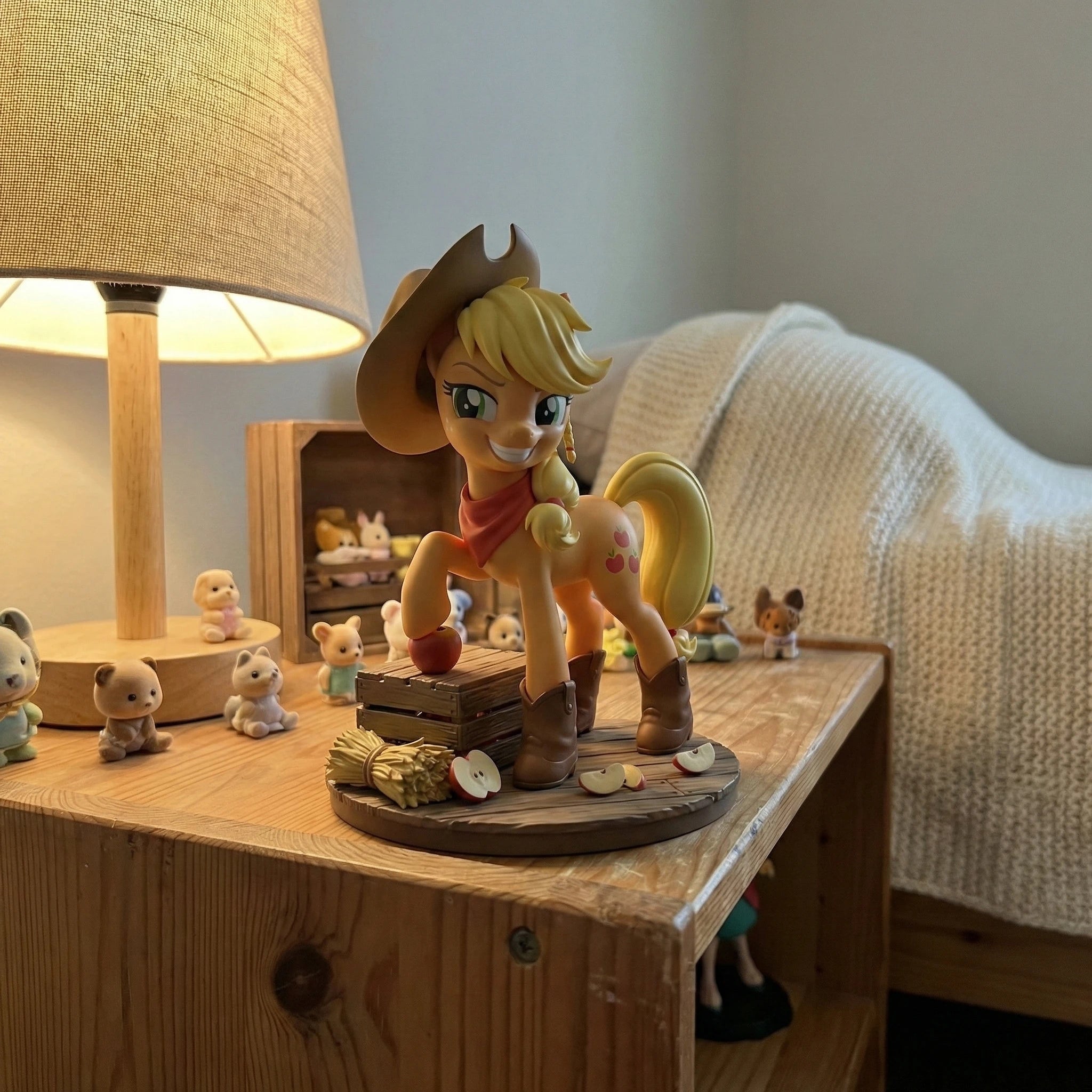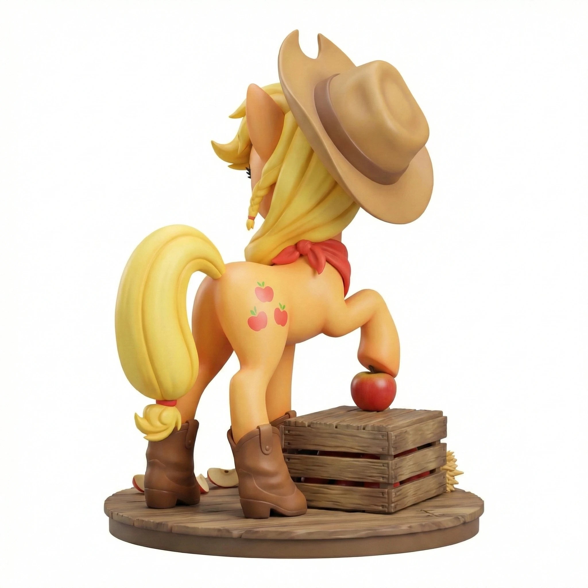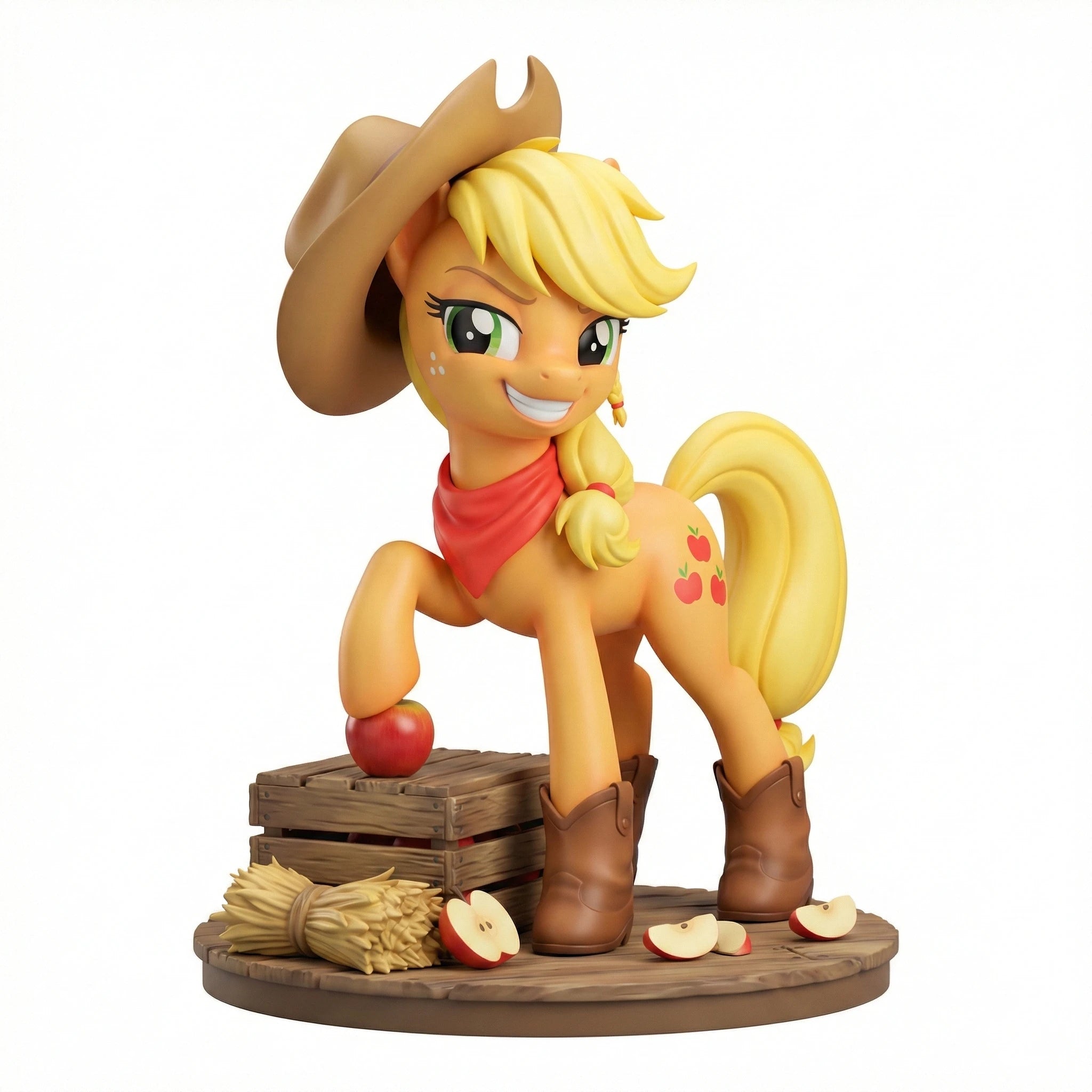 Welcome to the My Little Pony: Friendship is Magic Anime Figure Series V1, featuring Applejack, the Element of Honesty. This 1/7 scale anime-style figure captures her hardworking, down-to-earth spirit in a confident standing pose resting one hoof on a crisp red apple atop a weathered wooden crate base, surrounded by golden hay and scattered apple slices. Her signature brown cowboy hat, red neckerchief, and matching cowboy boots highlight her country roots as the caretaker of Sweet Apple Acres. Her iconic orange coat and blonde mane tied with red bands are rendered with natural gradients, and her freckled cheeks and warm, determined smile perfectly mirror her reliable personality. Every detail from her three-apple cutie mark to the texture of the wooden crate is hand-painted with meticulous precision. Crafted from high-quality PVC, this figure ensures durability and a vivid, true-to-series look that will stand out on any display shelf. As a core piece of the unified V1 series, this Applejack figure pairs seamlessly with her Mane Six friends to complete your slice of Equestria. Whether you're a long-time fan of the series or a dedicated anime figure collector, this piece is a must-have addition to your shelf. Bring home the magic of friendship and add Applejack to your collection today.