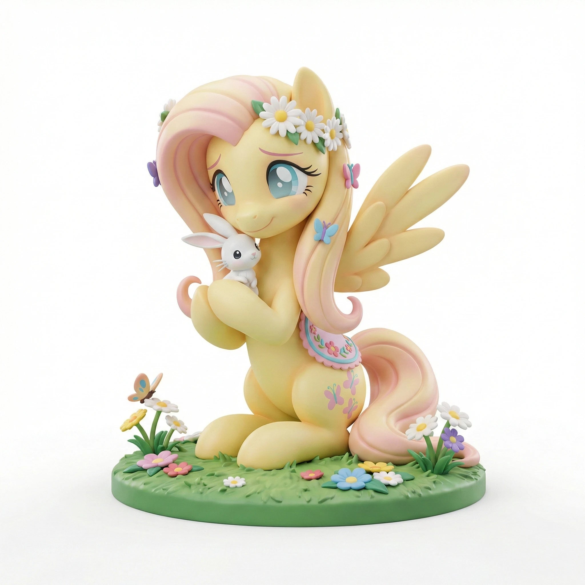Welcome to the My Little Pony: Friendship is Magic Anime Figure Series V1, featuring Fluttershy, the Element of Kindness. This 1/7 scale anime-style figure captures her gentle spirit in a graceful kneeling pose atop a lush meadow base filled with vibrant spring flowers. She tenderly cradles a small white bunny in her hooves, a perfect nod to her role as Ponyville's dedicated animal caretaker. Her iconic pale yellow coat and long flowing pink mane are rendered with smooth, lifelike gradients, adorned with a delicate crown of white daisies and colorful butterfly clips that highlight her love for nature. Her large, expressive eyes and soft smile perfectly mirror her sweet, shy personality, while every detail from the bunny's fur to the petals on the base is meticulously painted for a premium finish. Crafted from high-quality PVC, this figure ensures durability and a vivid, true-to-series look that will stand out on any display shelf. As a core piece of the unified V1 series, this Fluttershy figure pairs seamlessly with her Mane Six friends to complete your slice of Equestria. Whether you're a long-time fan of the series or a dedicated anime figure collector, this piece is a must-have addition to your shelf. Bring home the magic of friendship and add Fluttershy to your collection today.