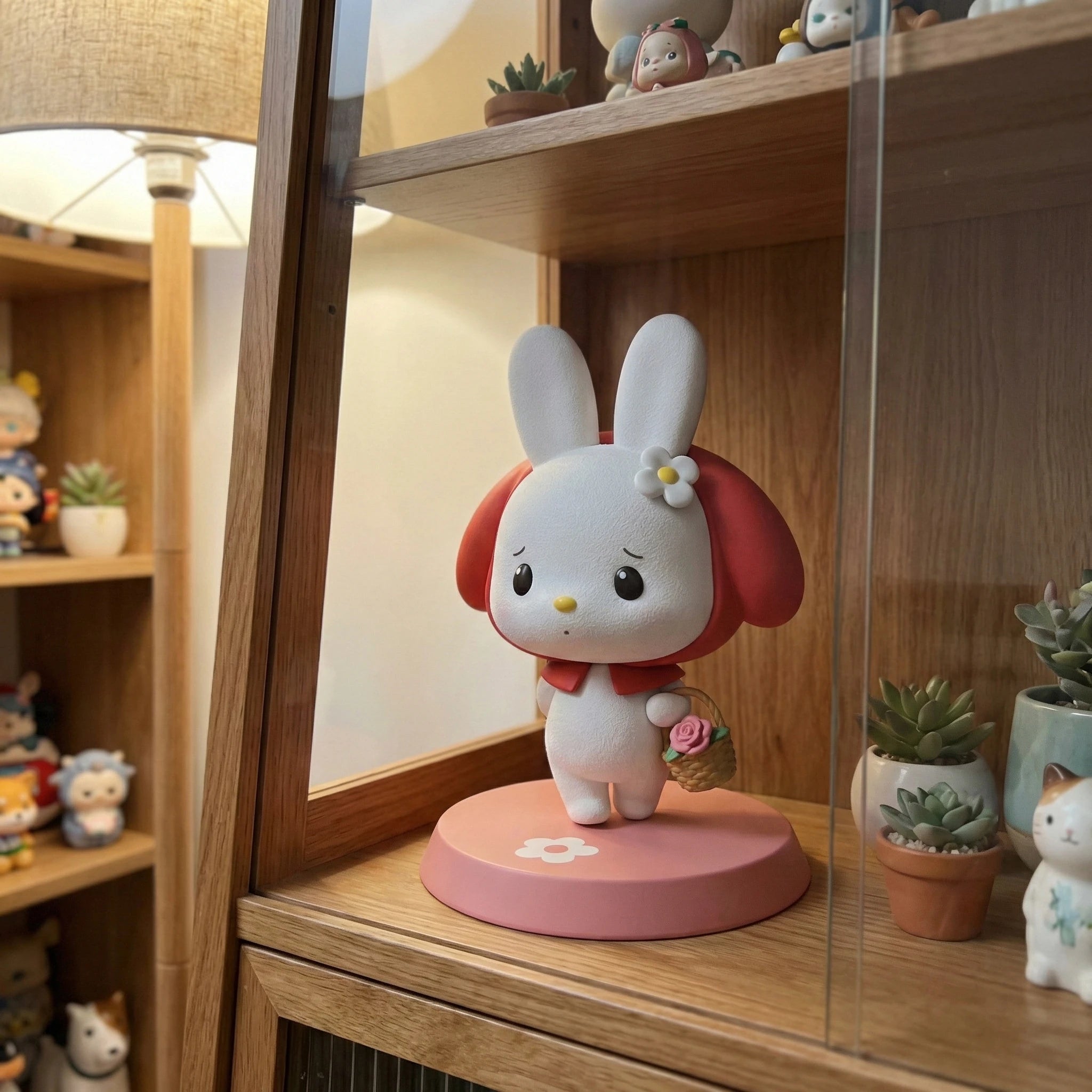 Bring home the gentle sweetness of My Melody with this 1/7 scale chibi figure from the Sanrio Characters Figure Series V1. Crafted from premium PVC material, this piece captures the beloved rabbit in a tender pose that highlights her classic storybook charm and kind, expressive nature. My Melody wears her iconic bright red hood, meticulously sculpted to frame her adorable white face and long rabbit ears. Her simple black dot eyes and small yellow nose pair with a slightly worried expression that adds an endearing layer of character depth. She holds a detailed woven basket containing a beautiful pink rose, showcasing the level of craftsmanship in every detail. Each figure is carefully hand-painted to ensure vibrant, true-to-original colors that stay bright and bold over time. The smooth, high-quality PVC finish adds a premium feel, making this piece stand out in any display. This figure stands elegantly on a solid pastel pink circular base adorned with a dainty white flower emblem, providing a sturdy and stylish foundation for your shelf or collection. Whether you’re a lifelong Sanrio fan or a dedicated collector of cute chibi figures, this My Melody piece is a must-have addition to your lineup. Complete your Sanrio Characters Figure Series V1 collection with this heartwarming, charming figure and let My Melody’s gentle vibe brighten your space.
