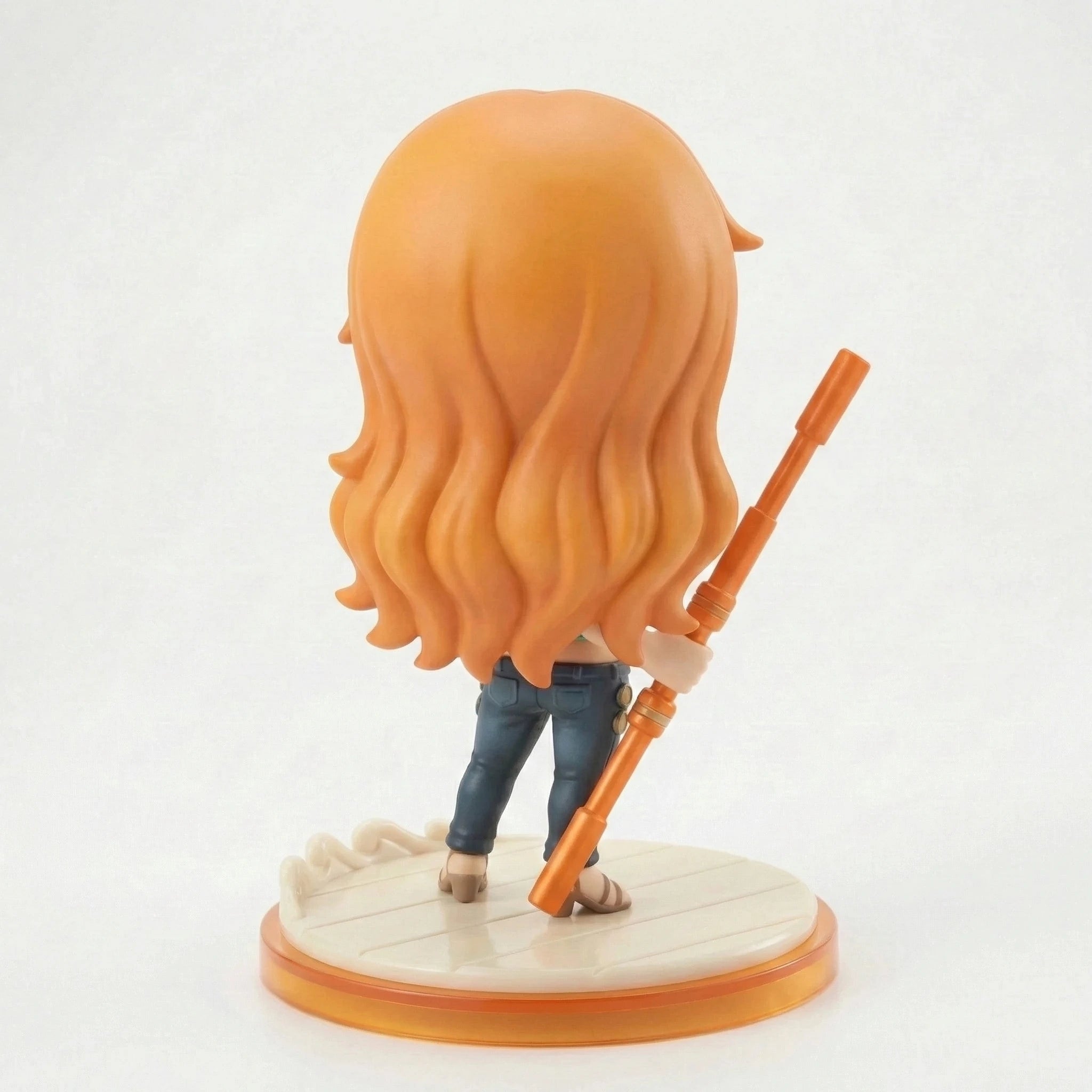 Join the Grand Line adventure with Nami, the clever master navigator of the Straw Hat Pirates from the One Piece universe, brought to life in the charming One Piece Figure Series V1 chibi collection. This figure captures Nami's confident personality with a poised pose, her vibrant long orange hair styled in soft waves, and a determined yet friendly expression. She wears her iconic post-timeskip outfit: a teal top, low-rise blue jeans, and stylish high-heeled sandals, with her precise pinwheel and tangerine tattoo visible on her left shoulder. She holds her iconic Clima-Tact staff, featuring a realistic metallic finish and segmented design. Crafted from high-quality PVC material with professional hand-painted finishes, every detail is vivid—from the depth of her hair color to the textures of her clothing. The figure stands on a circular base designed to look like a weathered wooden ship deck, complete with a sculpted ocean wave detail that ties into the series' nautical theme. This must-have collectible is perfect for any One Piece enthusiast looking to grow their Straw Hat Pirates display. Display it proudly alongside other members of the One Piece Figure Series V1 to complete your crew and bring a piece of the Grand Line to your shelf.