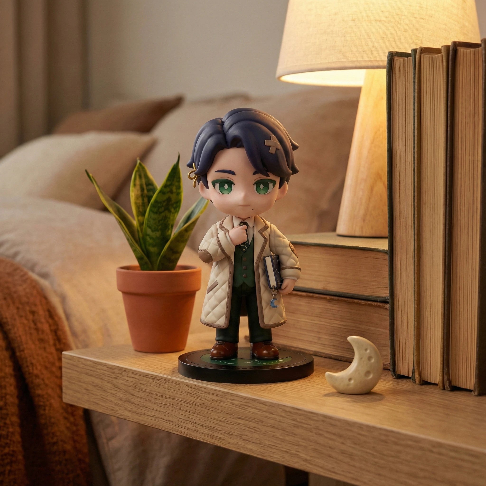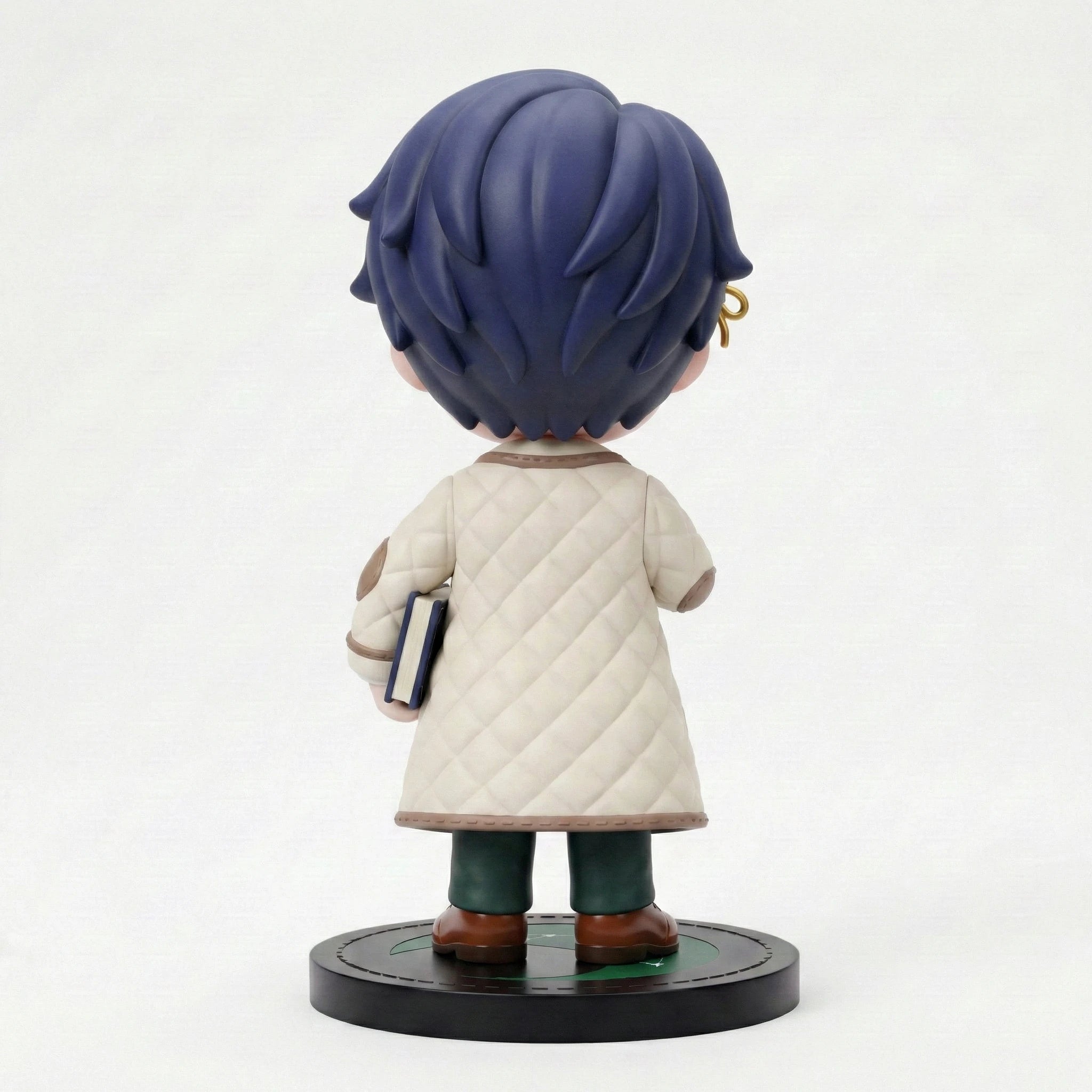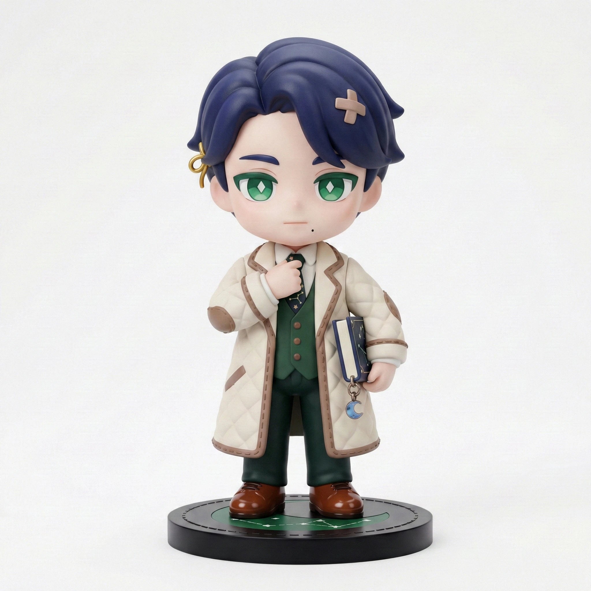 As part of the LumiPals Atelier Figure Series V1, this chibi figure captures Orion Patchscribe, the dedicated archivist and strategist of the floating workshop, who maps every stitch into constellations and keeps the lore of the stars alive. His calm, scholarly nature is perfectly captured in this charming 1/7 scale collectible, a refined addition to any display. Every detail reflects his meticulous personality, from his deep navy hair with a neat side-part, gold thread loop, and distinctive X-shaped patch to his long cream coat with quilted elbow patches and stitched edging, layered over a forest-green vest and star-chart printed tie. His sharp emerald diamond eyes and small mole under his lip add depth to his composed expression, and he holds a compact star-map book with a dangling blue moon charm. Orion stands upright on a specialized base featuring a glowing green star-map design, highlighting his role as a lore keeper. Crafted from high-quality PVC with meticulous hand-painted details, this premium piece is essential for fans of the series. Add Orion Patchscribe to your LumiPals Atelier set and help preserve the stories of the stars.
