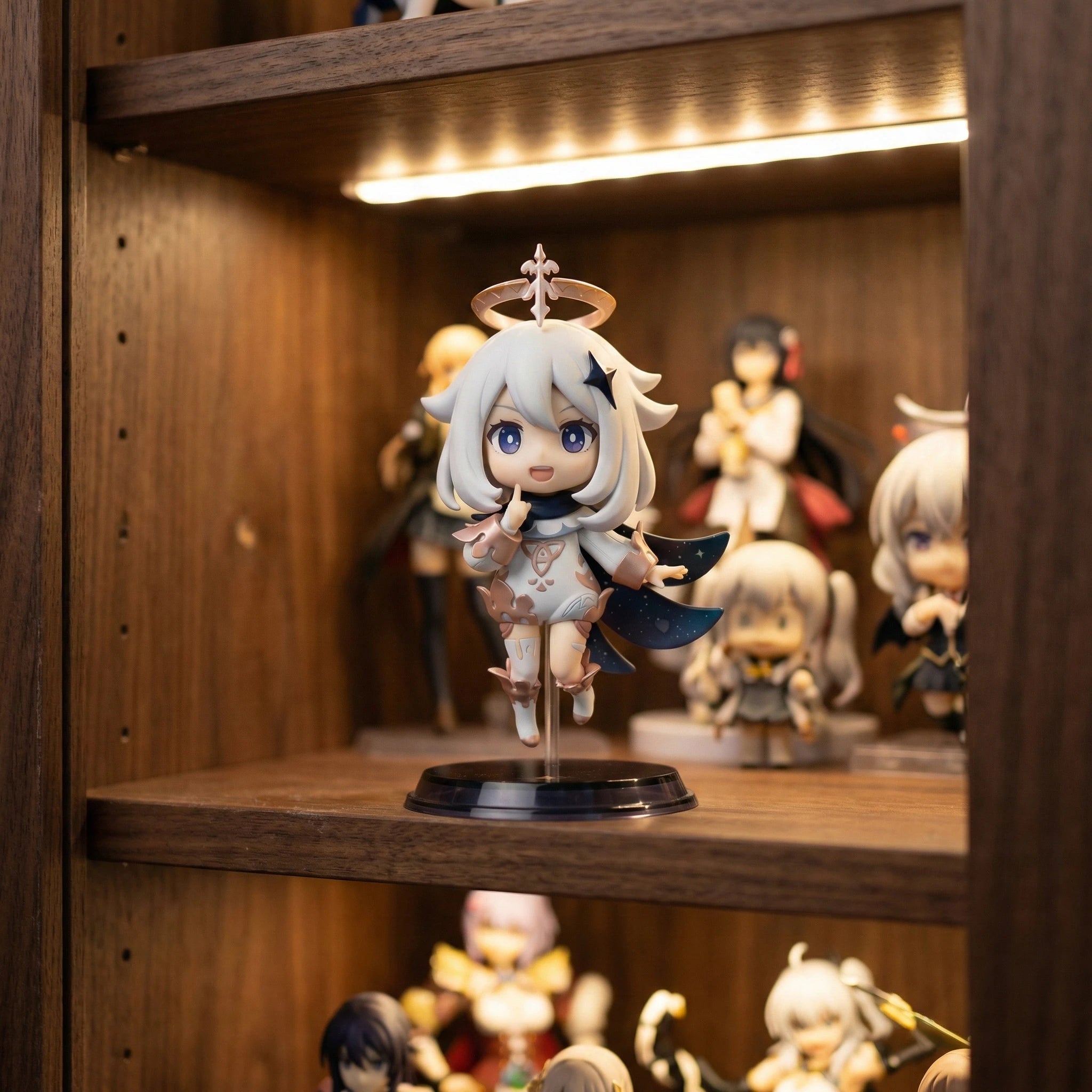 Every iconic detail of Paimon’s design is meticulously recreated in high-quality PVC, with precise hand-painted finishes bringing her to life. Her soft white hair frames expressive indigo eyes, topped with her distinctive floating halo crown and star hair ornament. Her celestial outfit features intricate gold trim and cosmic patterns on her white bodysuit, paired with a flowing dark cape that mimics a star-filled night sky.