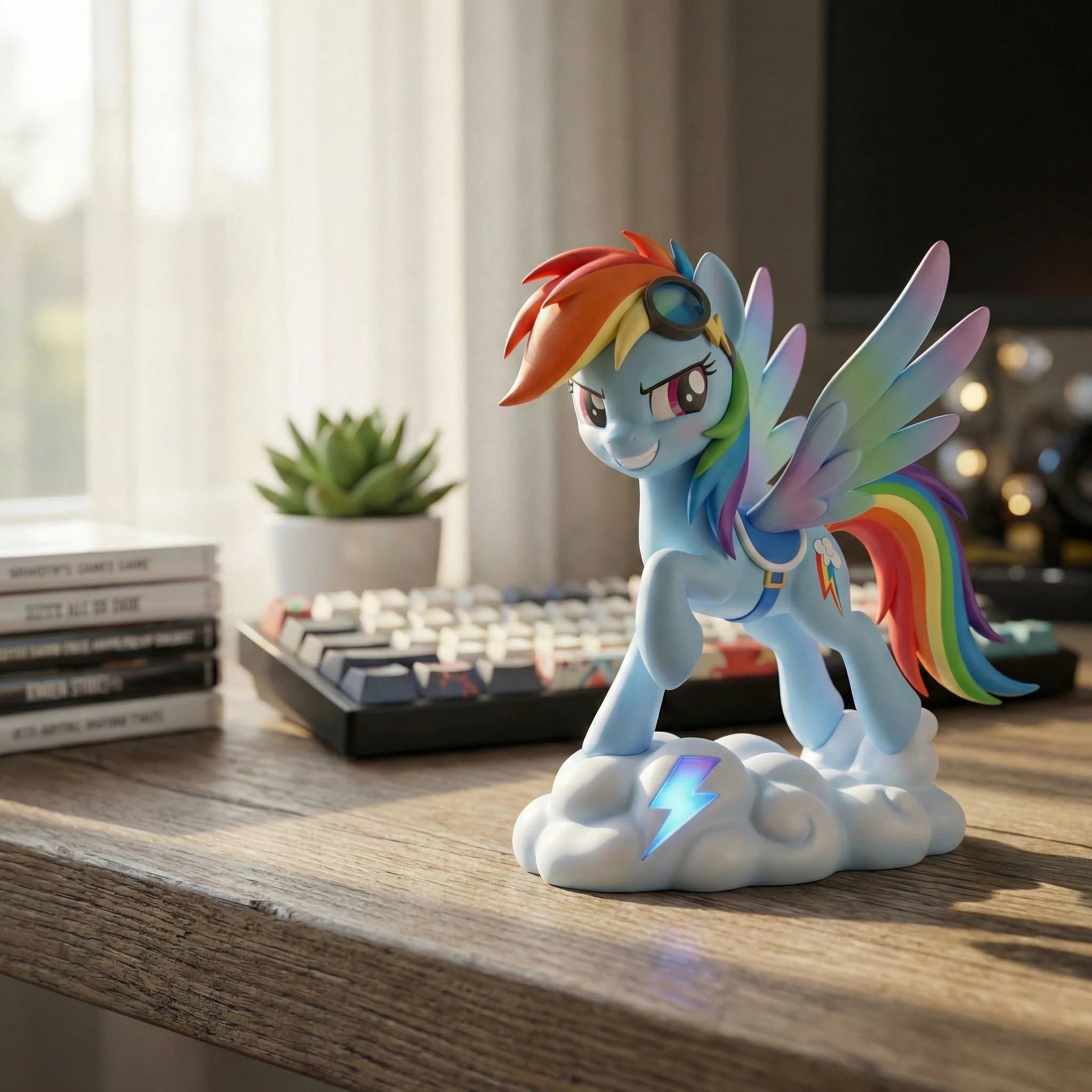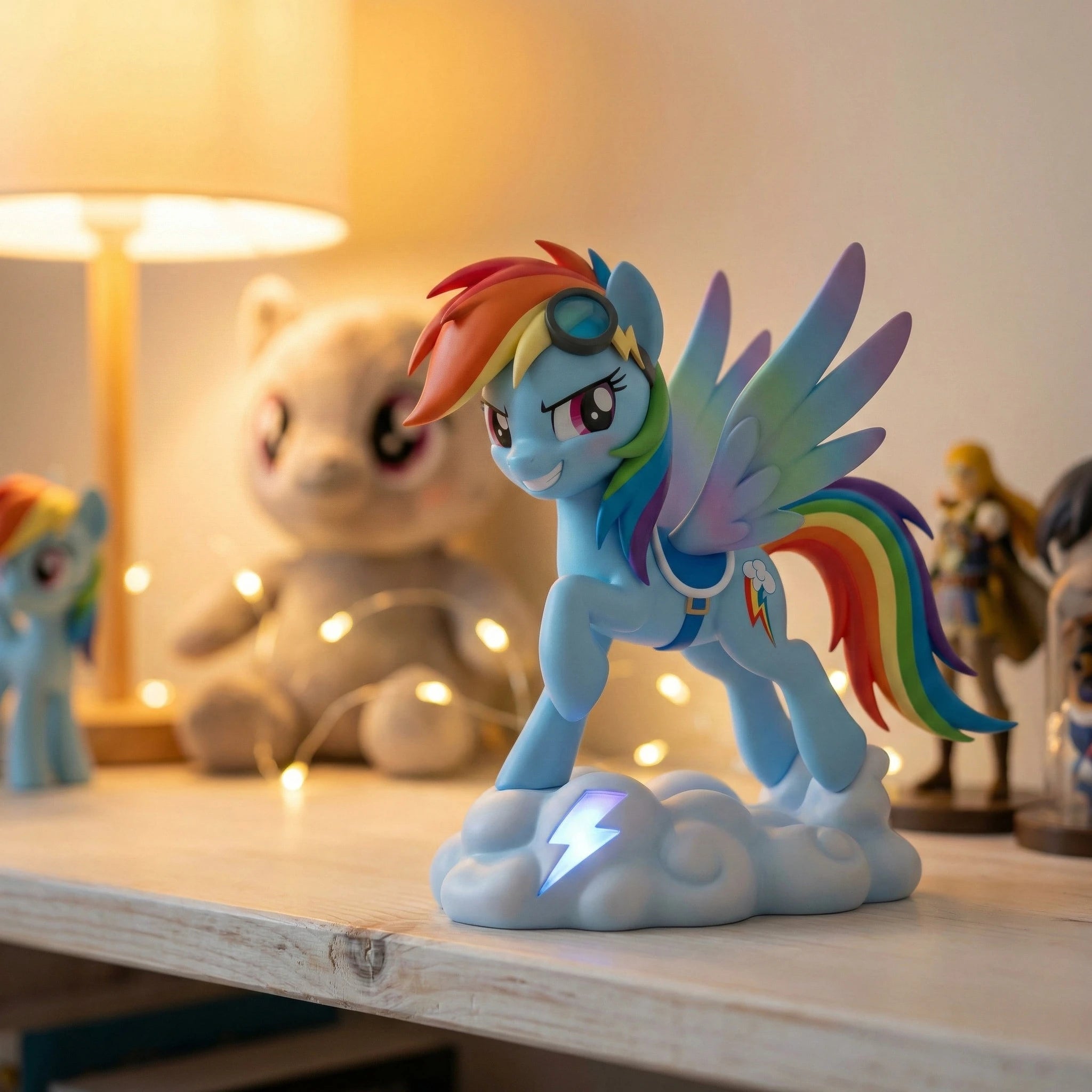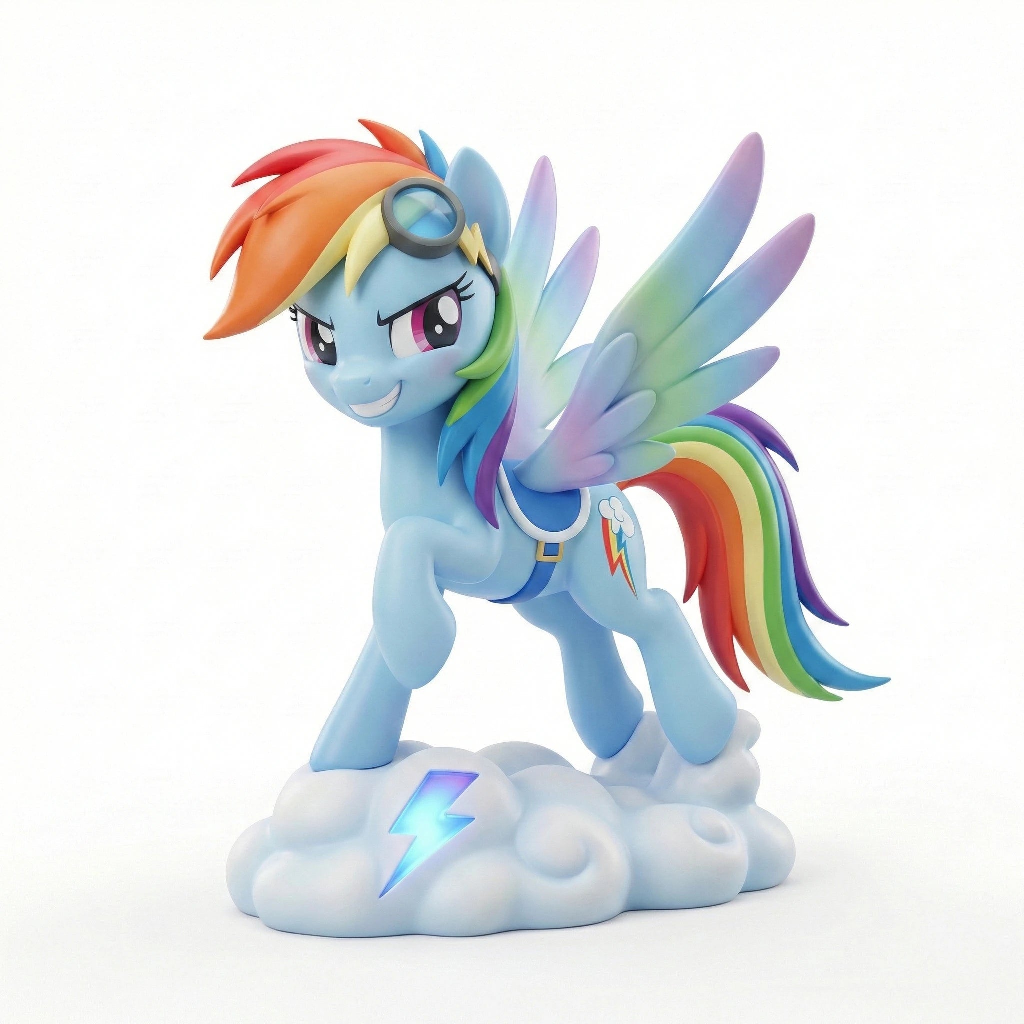 Welcome to the My Little Pony: Friendship is Magic Anime Figure Series V1, featuring Rainbow Dash, the Element of Loyalty. This 1/7 scale anime-style figure captures her bold, confident spirit in a dynamic standing pose atop a sculpted cloud base accented with her signature lightning bolt. Her wings are spread wide, ready to take flight and perform her legendary Sonic Rainboom, showcasing her status as Equestria's fastest flier. Her iconic sky-blue coat and vibrant rainbow mane and tail are rendered with crisp, bright gradients, and she sports her classic aviator goggles perched on her head plus a sleek blue harness that emphasizes her athletic build. Her determined smirk and sharp, expressive eyes perfectly mirror her fearless personality, while every detail from the lightning bolt on her base to the individual streaks in her mane is hand-painted with precision. Crafted from high-quality PVC, this figure ensures durability and a vivid, true-to-series look that will stand out on any display shelf. As a core piece of the unified V1 series, this Rainbow Dash figure pairs seamlessly with her Mane Six friends to complete your slice of Equestria. Whether you're a long-time fan of the series or a dedicated anime figure collector, this piece is a must-have addition to your shelf. Bring home the magic of friendship and add Rainbow Dash to your collection today.