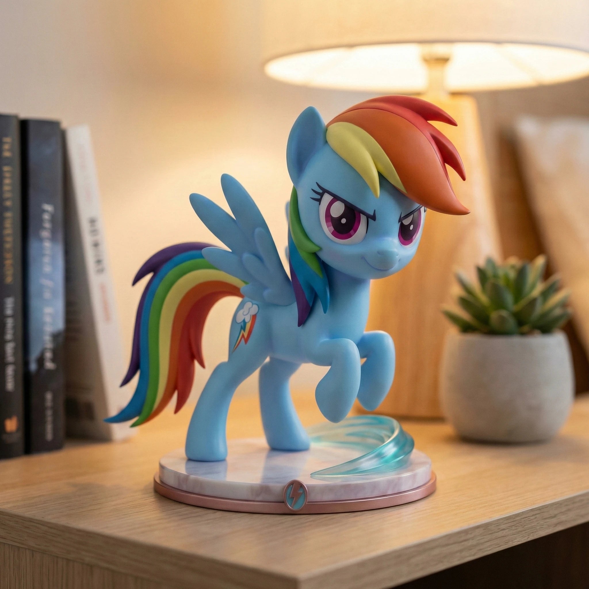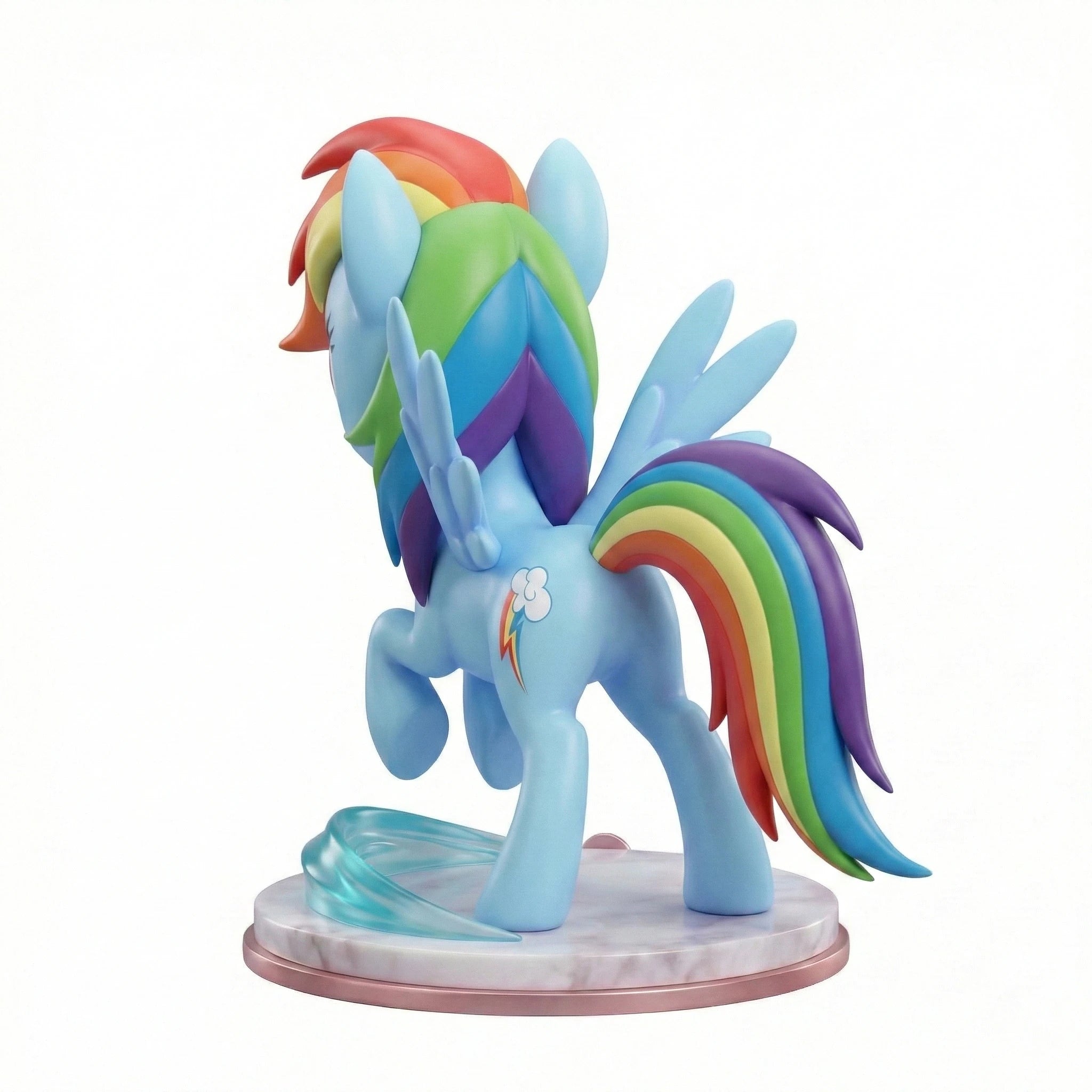 Crafted from high-quality PVC with meticulous hand-painted finishes, every detail shines – from the windswept strands of her rainbow mane to the determined glint in her magenta eyes. The figure rests on a stylized translucent blue energy base atop a marbled circular pedestal accented with a metallic lightning bolt emblem, matching her bold spirit.
