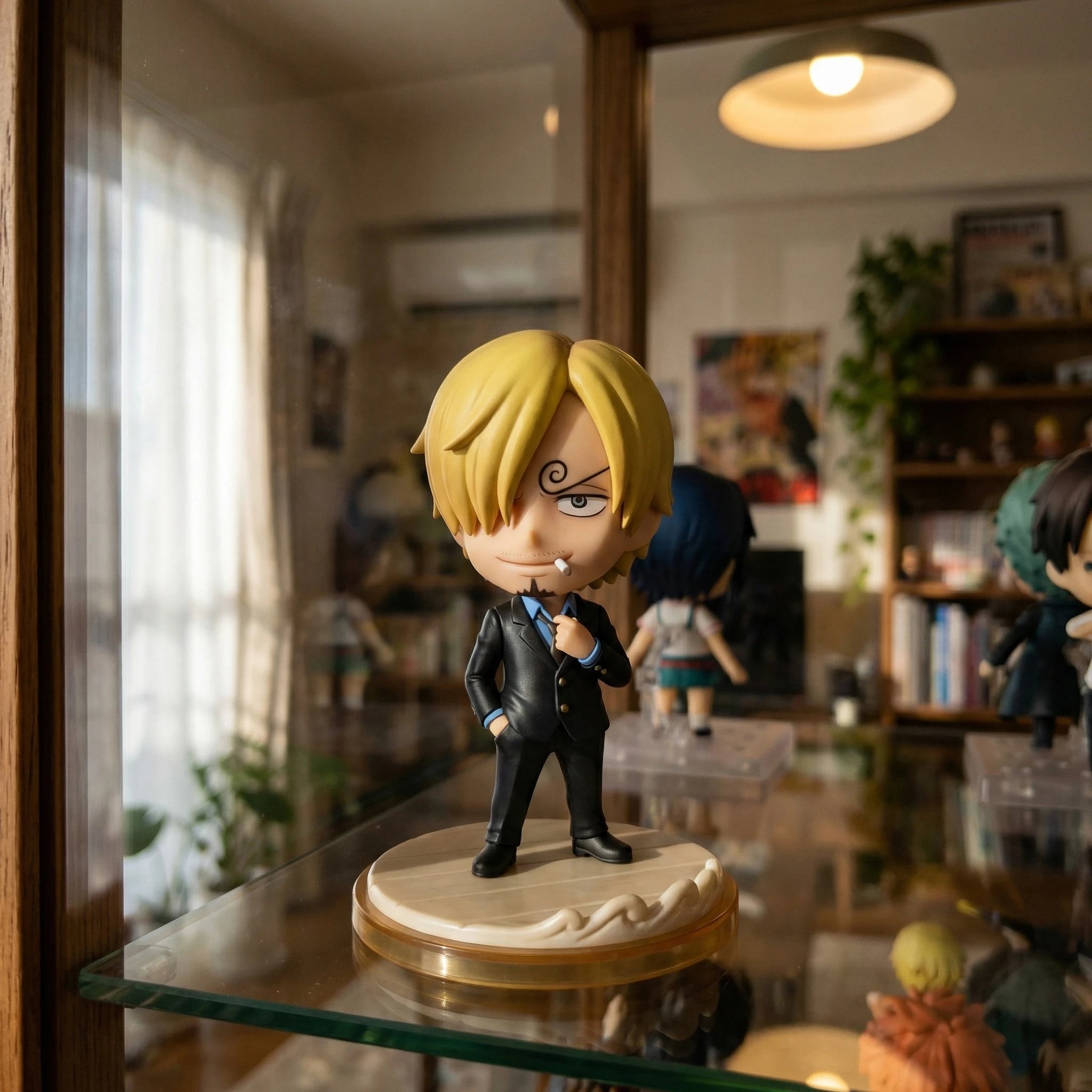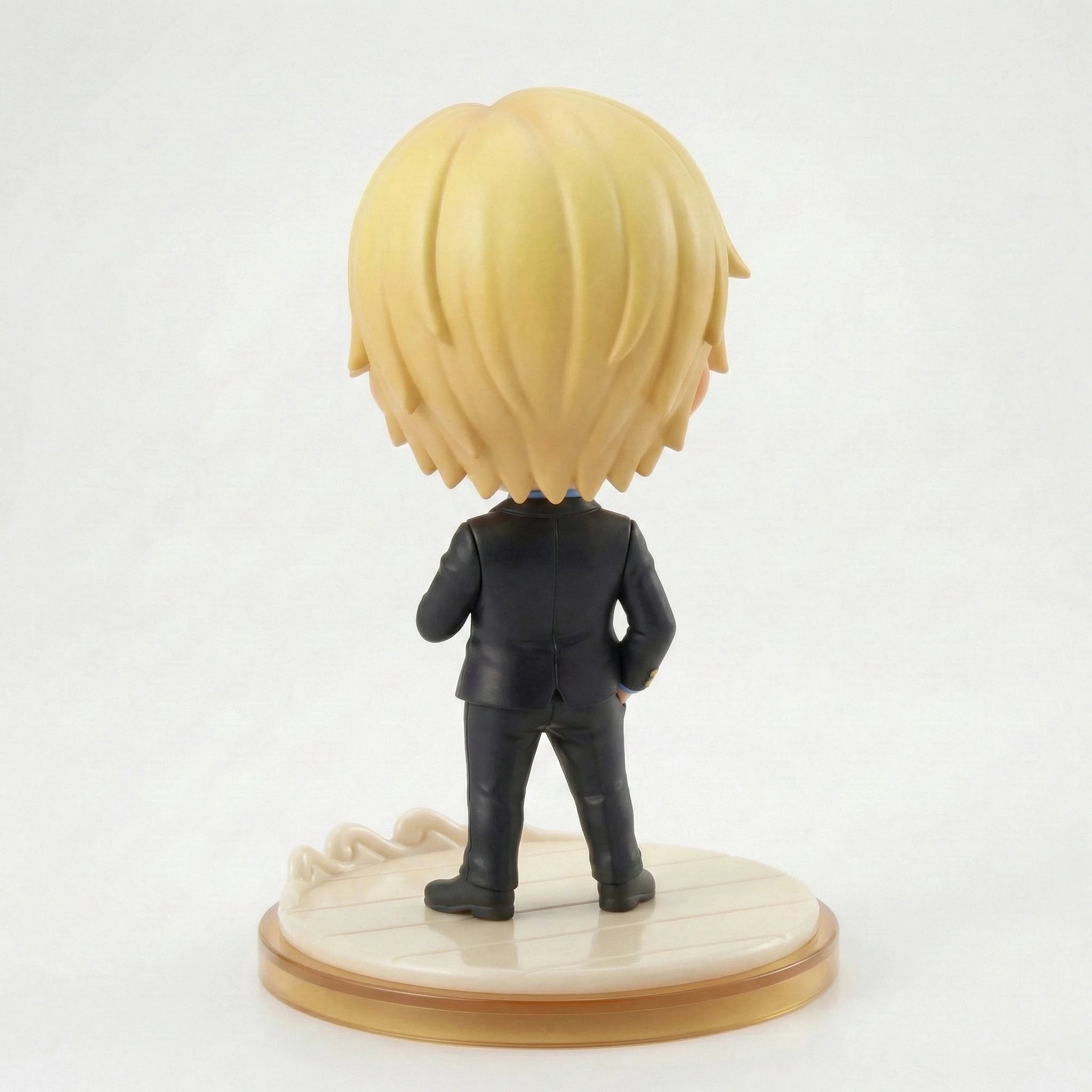 Join the Grand Line adventure with Sanji, the suave world-class chef and fierce fighter of the Straw Hat Pirates from the One Piece universe, brought to life in the charming One Piece Figure Series V1 chibi collection. This figure captures Sanji's refined gentlemanly aesthetic with a relaxed pose—one hand tucked into his trouser pocket and the other adjusting his tie, a cigarette in his mouth, and his signature blond swept hair with a spiral eyebrow. He wears his classic post-timeskip outfit: a tailored black suit with golden buttons, a light blue dress shirt, and a dark tie. Crafted from high-quality PVC material with professional hand-painted finishes, every detail is precise—from the subtle stubble on his chin to the crisp texture of his suit. The figure stands on a circular base designed to look like a weathered wooden ship deck, complete with a sculpted ocean wave detail that ties into the series' nautical theme. This must-have collectible is perfect for any One Piece enthusiast looking to grow their Straw Hat Pirates display. Display it proudly alongside other members of the One Piece Figure Series V1 to complete your crew and bring a piece of the Grand Line to your shelf.