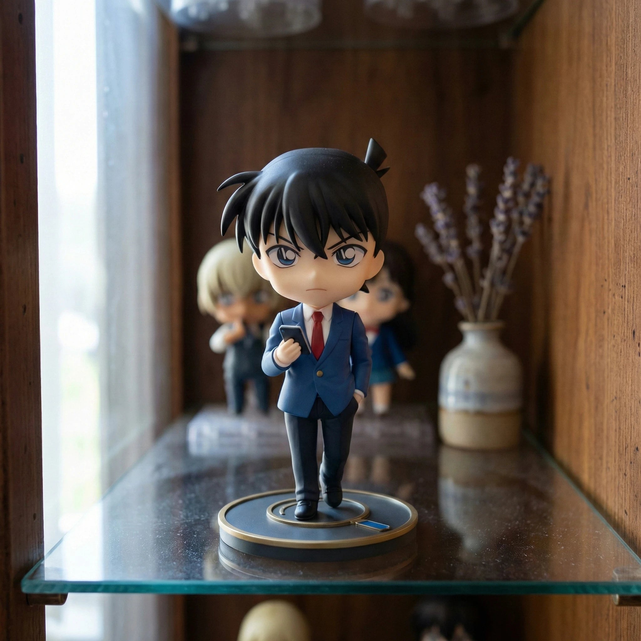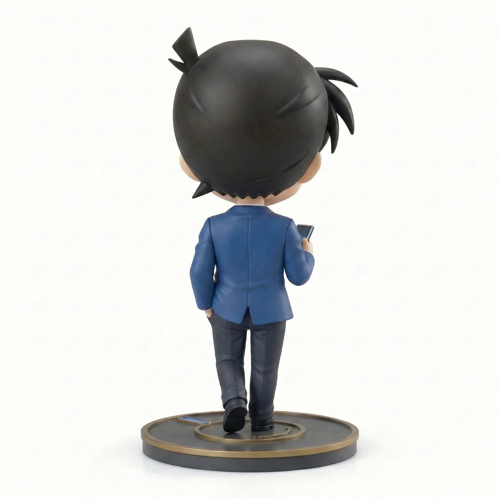 Step into the world of high-stakes deduction with this brilliant entry in the Detective Conan Figure Series V1 chibi collection featuring Shinichi Kudo, the teen genius detective before his fateful transformation. Capturing his sharp intellect and confident stance, this figure shows him in his iconic Teitan High School uniform: a crisp blue blazer over a clean white dress shirt and vibrant red necktie. His focused blue eyes and serious expression mirror his deductive skills, as he glances down at his smartphone likely reviewing clues for his latest case. His messy black spiky hair is sculpted with precision, staying true to his classic anime appearance, with one hand tucked casually into his pocket and the other holding his phone. Crafted from premium PVC with delicate hand-painted details, every element from the strands of his hair to the screen of his phone is carefully rendered for accuracy. The figure rests on a sleek dark circular base with polished gold trim and a subtle magnifying glass motif, tying into the detective theme. As part of the unified V1 chibi series, this collectible is an essential addition for fans looking to showcase their love for the legendary ace detective alongside other characters from the series.