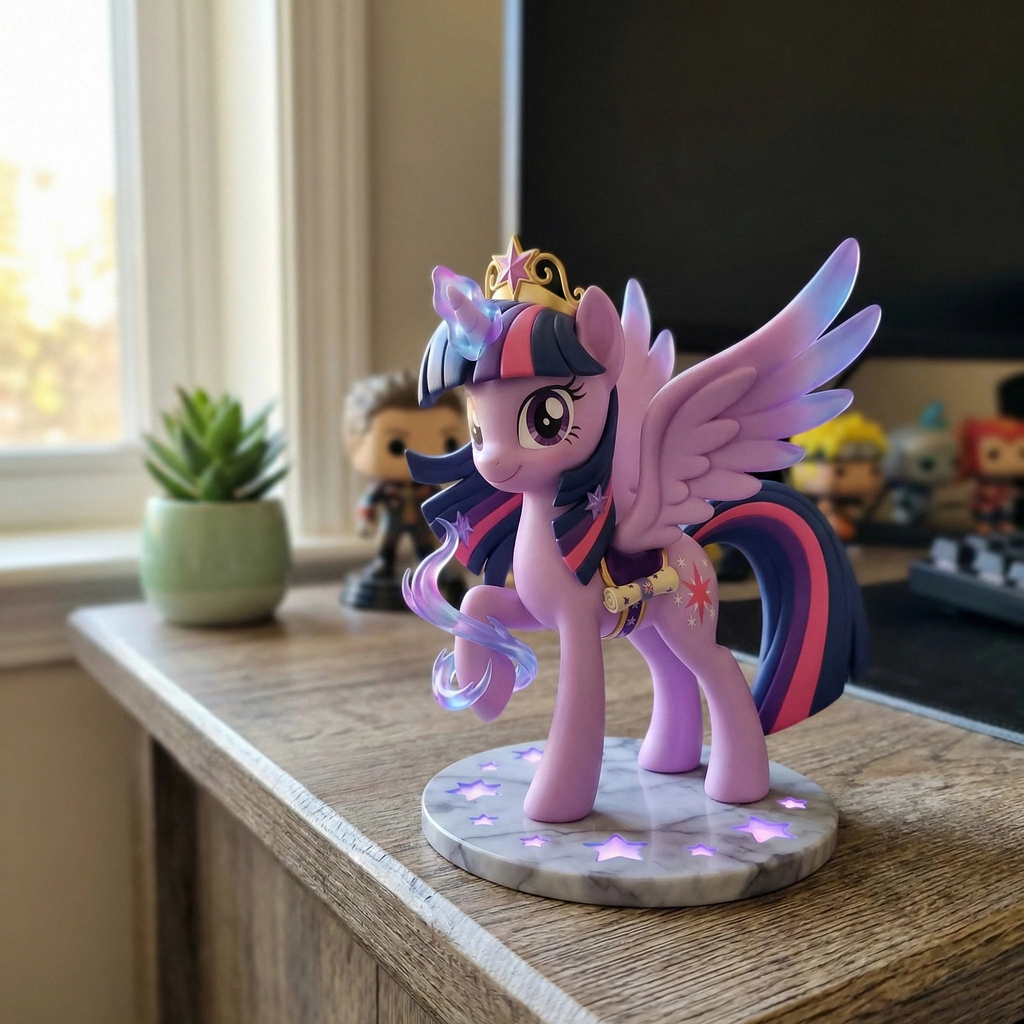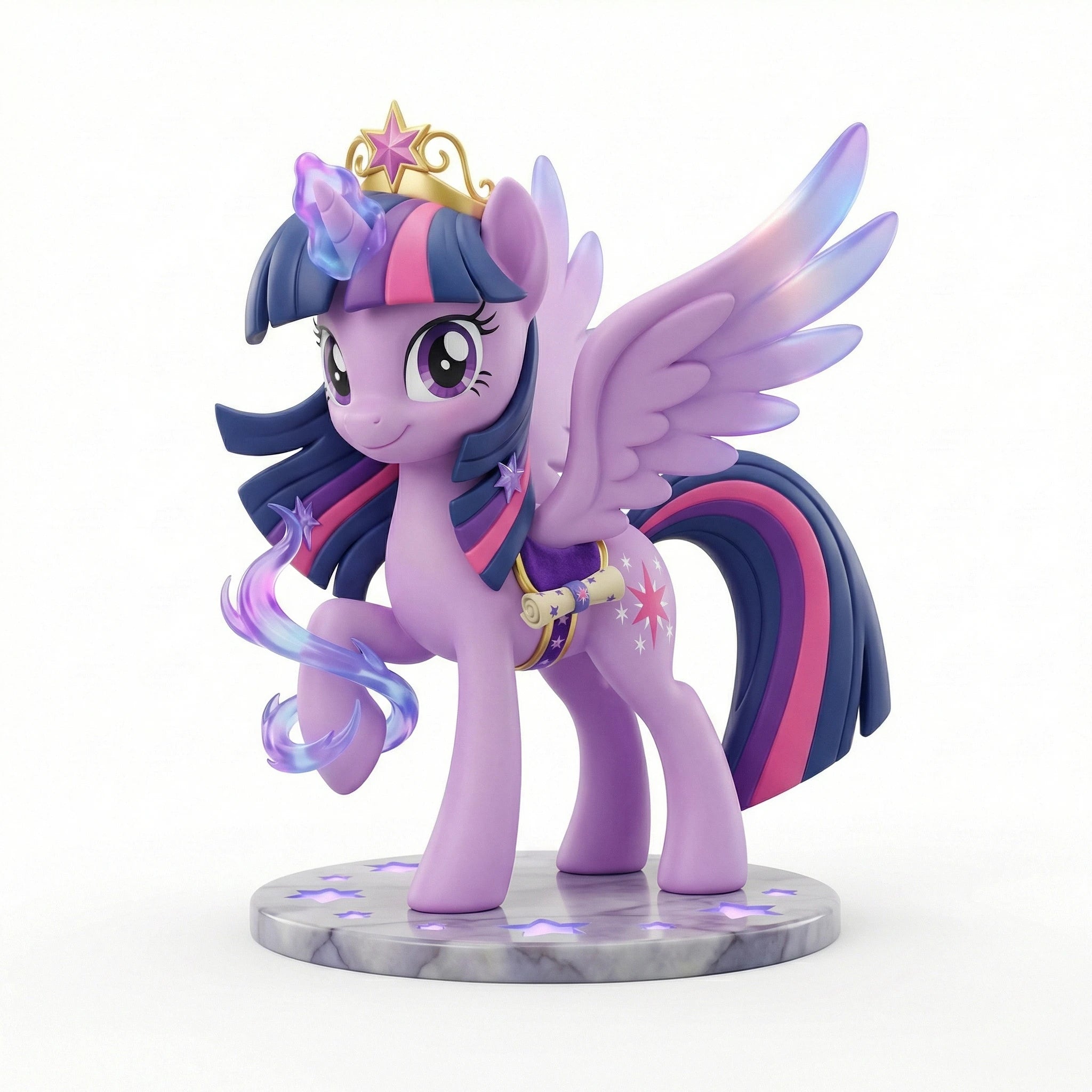 Welcome to the My Little Pony: Friendship is Magic Anime Figure Series V1, featuring Twilight Sparkle, the Element of Magic and Princess of Equestria. This 1/7 scale anime-style figure captures her wise, warm spirit in a graceful standing pose atop a premium marble-patterned base adorned with glowing purple stars. A translucent magic effect swirls around her front hoof, mimicking the ethereal glow of her unicorn sorcery, while she carries her trusty scroll tucked into her saddlebags, ready to document her latest lesson in friendship. Her iconic violet coat and flowing navy mane with pink and purple streaks are rendered with precise gradients, and she wears her elegant golden crown symbolizing her royal status. Her gentle smile and bright, inviting eyes perfectly mirror her kind, scholarly personality, while every detail from the prismatic gradient on her wings to the stars on her base is hand-painted with care. Crafted from high-quality PVC, this figure ensures durability and a vivid, true-to-series look that will stand out on any display shelf. As a core piece of the unified V1 series, this Twilight Sparkle figure pairs seamlessly with her Mane Six friends to complete your slice of Equestria. Whether you're a long-time fan of the series or a dedicated anime figure collector, this piece is a must-have addition to your shelf. Bring home the magic of friendship and add Twilight Sparkle to your collection today.